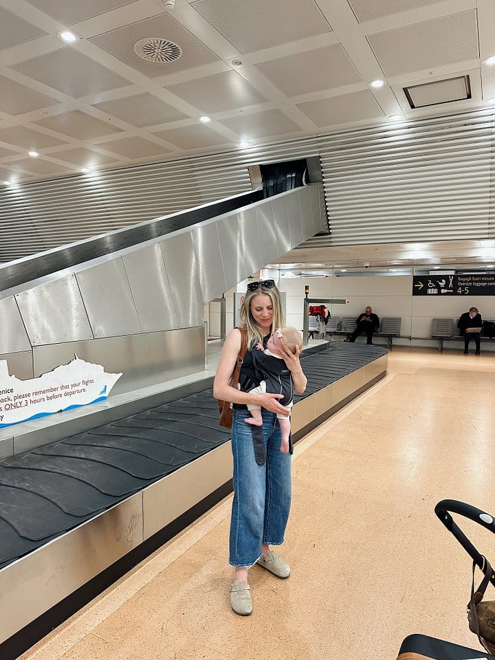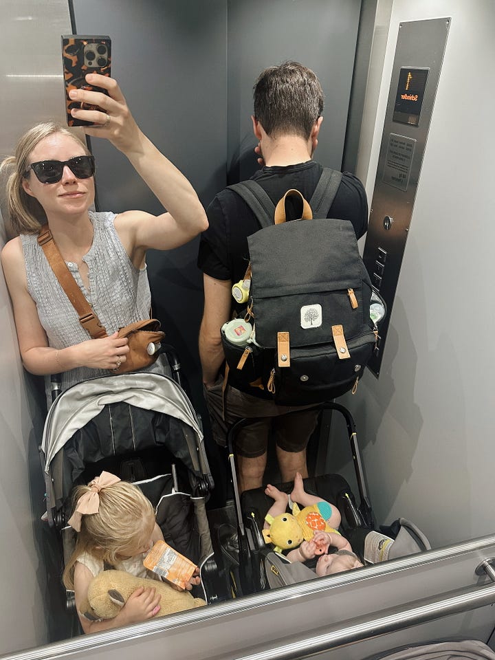 Our *tiny* Viennese elevator and a moment in the Venice airport with our tired tiny.